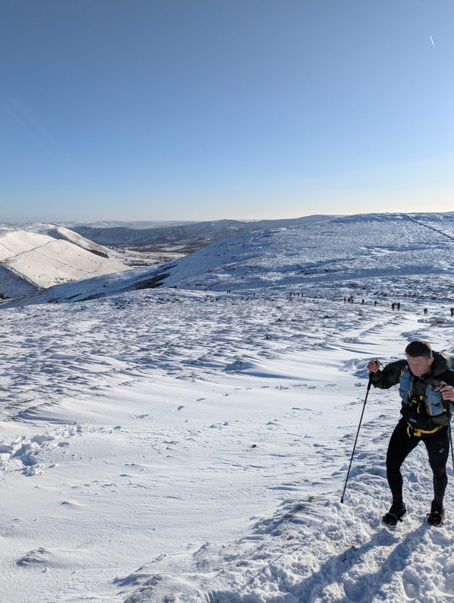 Heading up and over Kinder was entertaining – the snow slowly getting deeper, on the downhill section past Kinder Downfall some contestants simple sledged in their waterproofs down the hill, hoping not to find any rocks enroute! It was a bit of a slog getting across to the A57, at points having to stay in the footsteps a foot deep in the snow to make the going easier. A group casually cross country ski’d in the opposite direction at one point near Featherbed Top……