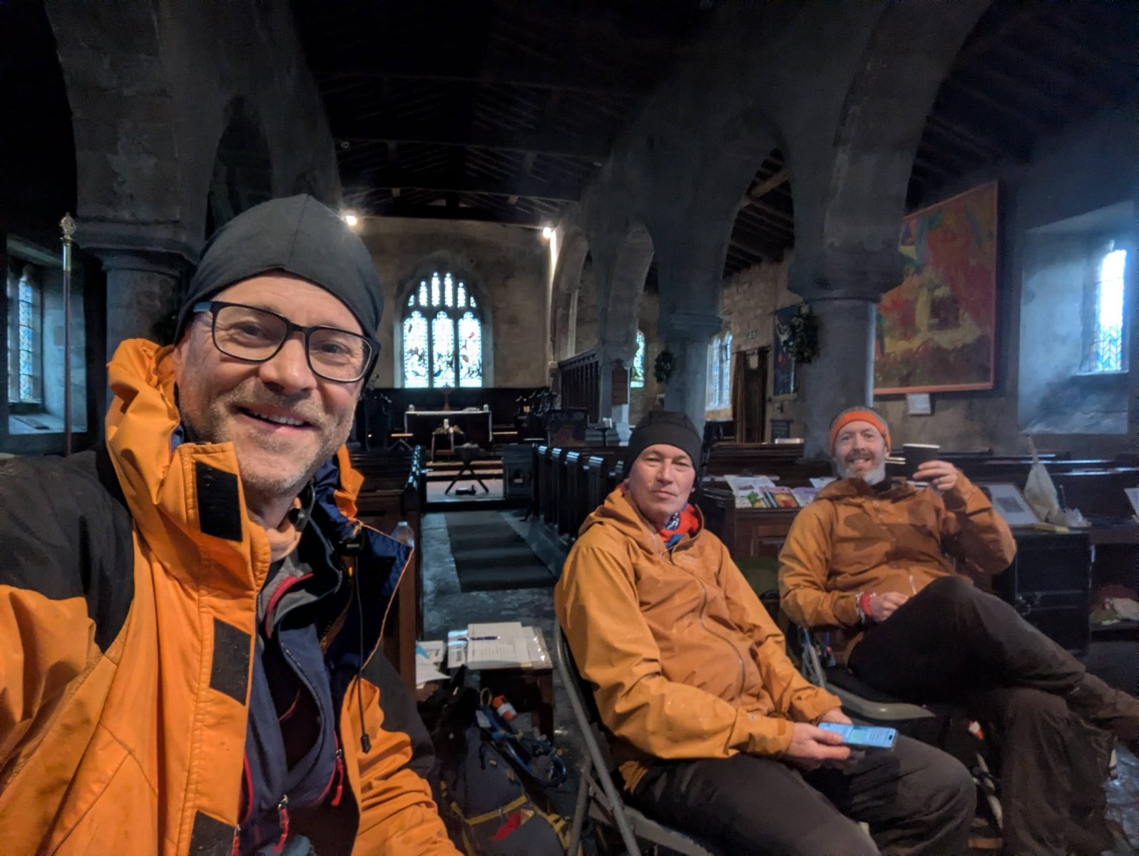 You’d expect that the place where most people start and finish the Yorkshire Three Peaks would have a good range of cafes and pubs – but most of them have closed, and the remainder were not open on a Monday morning – however, the others noticed a sign at the Church saying ‘come in for a cuppa’ – so we did. It was a touch cold in there – but a cup of tea, some biscuits and some paracetamol fixed me (picture from Andrew) – having told the others to go ahead as I was slowing them down, as soon as we’d moved on through the village (I stopped at the public toilets), I overtook the other two who were losing some layers when the sun made a rare morning appearance, and promptly gapped them for a couple of hours, jogging more than I had done for ages on the path up to the Cam High Road.