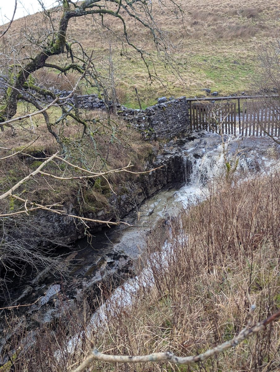 I would have likely kept this gap, if I hadn’t then started to feel massively mentally tired and starting to forget how long I’d be running – I remember stopping to admire the waterfalls at Ling Gill then….some road…then I was sheltering behind a wall from the wind, 600 metres up, having to close my eyes for a bit. About 15 minutes later (having managed to just remember to set an alarm, I surface just as the other two I’d been with over Fountains Fell came past) – suitably refreshed I leapt up (wishful thinking), and we cracked on over the Cam High Road together, occasionally getting glimpses of the view across the valley through the clouds.